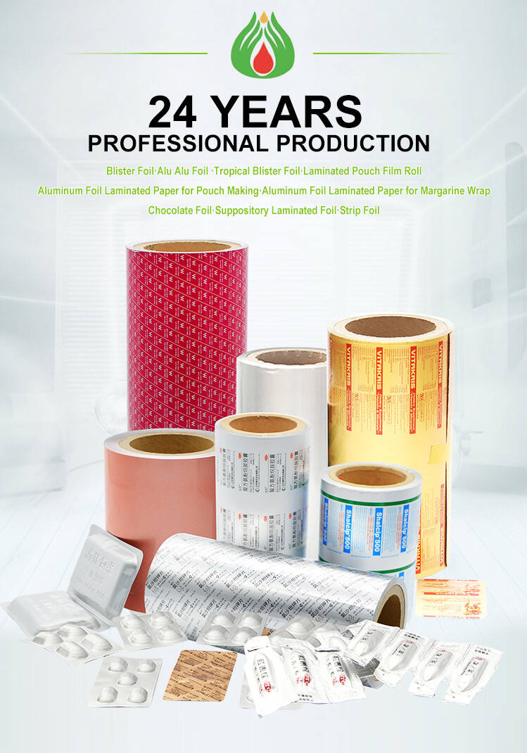 Nous produisons principalement des feuilles d'aluminium pour l'emballage pharmaceutique (telles que feuillard pour plaquettes, feuillard alu-alu, feuillard pour bande et feuillard pour suppositoires ),